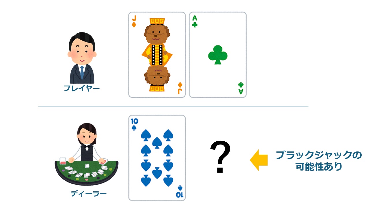 ディーラーのオープンカードがエースの場合は、3割程度の確率でディーラーにブラックジャックが完成します。